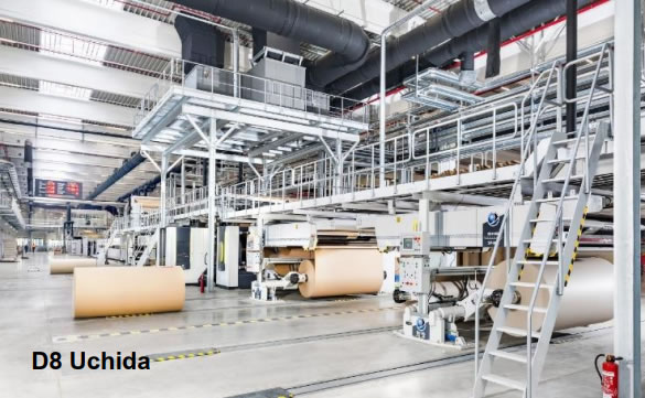 A Onduladeira UCHIDA D8 , com aproximadamente 135 metros de comprimento, largura de 1,60m atingindo 120m/min. composta de corrugados em onda “B”,